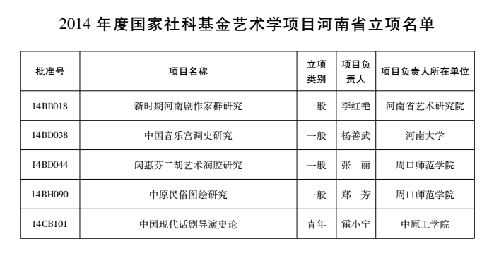 2014年度国家社科基金艺术学项目河南省立项名单
