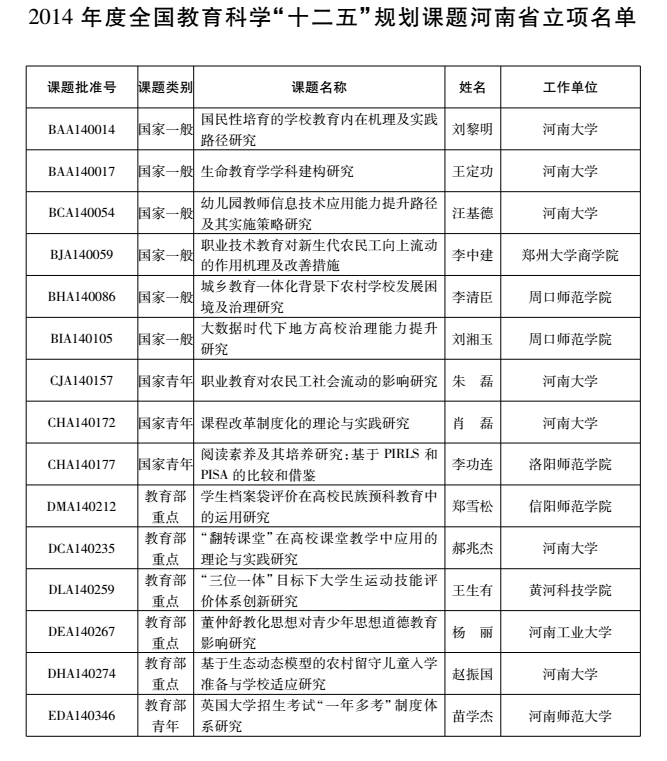 2014年度全国教育科学“十二五”规划课题河南省立项名单