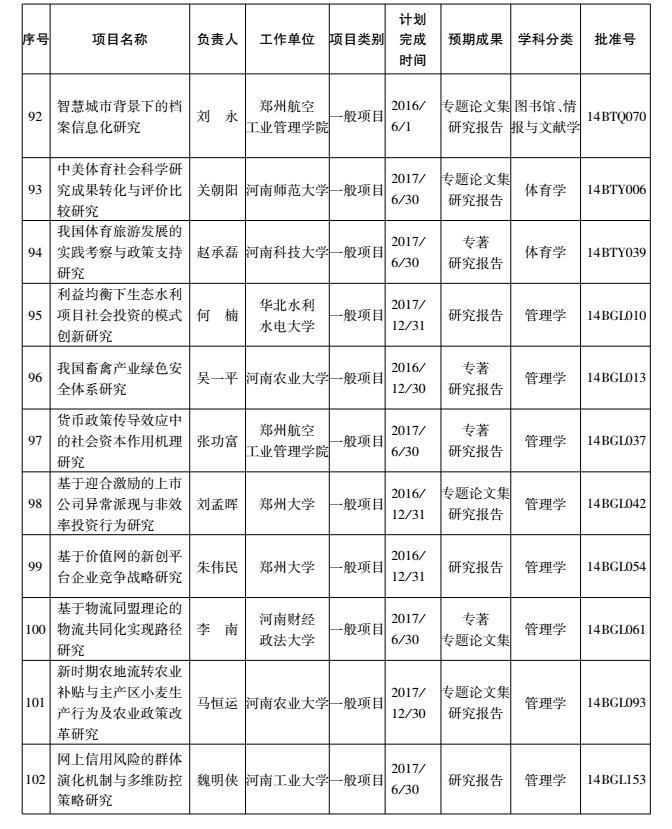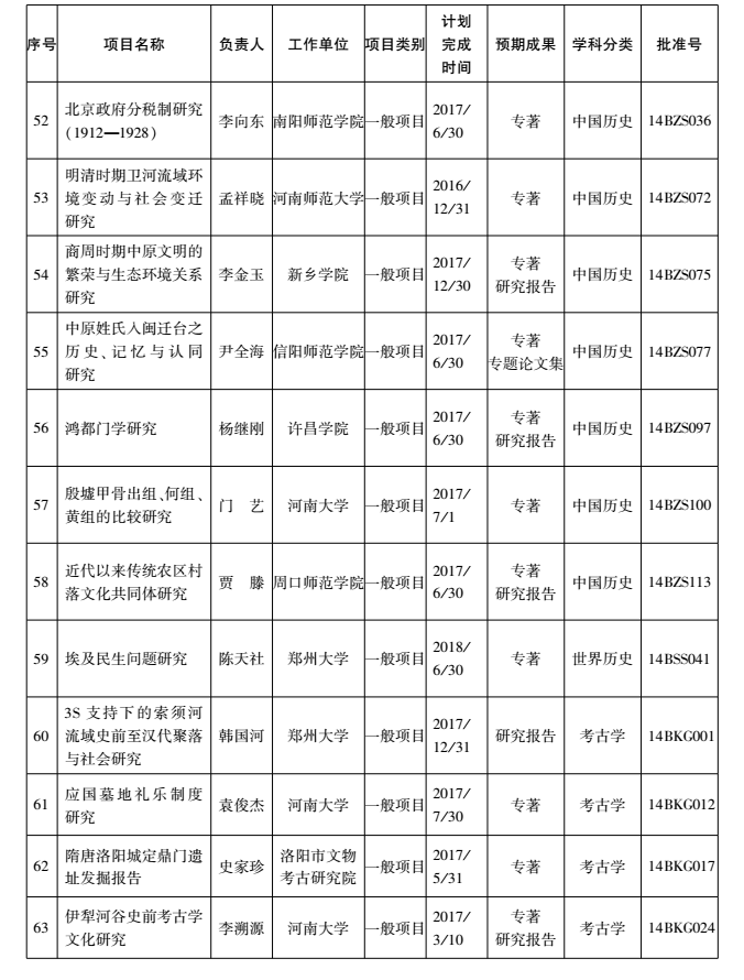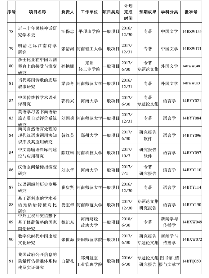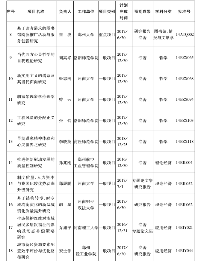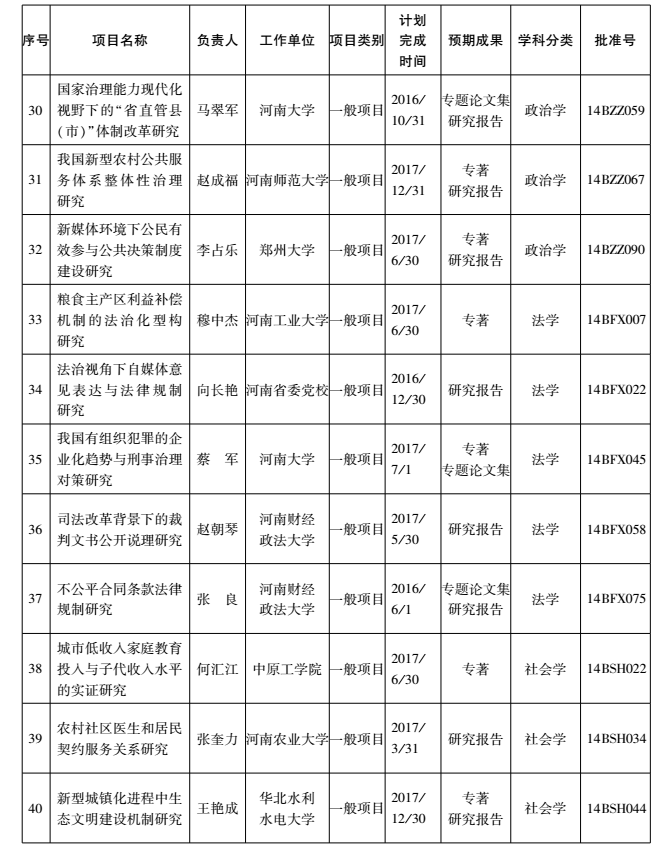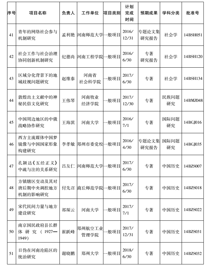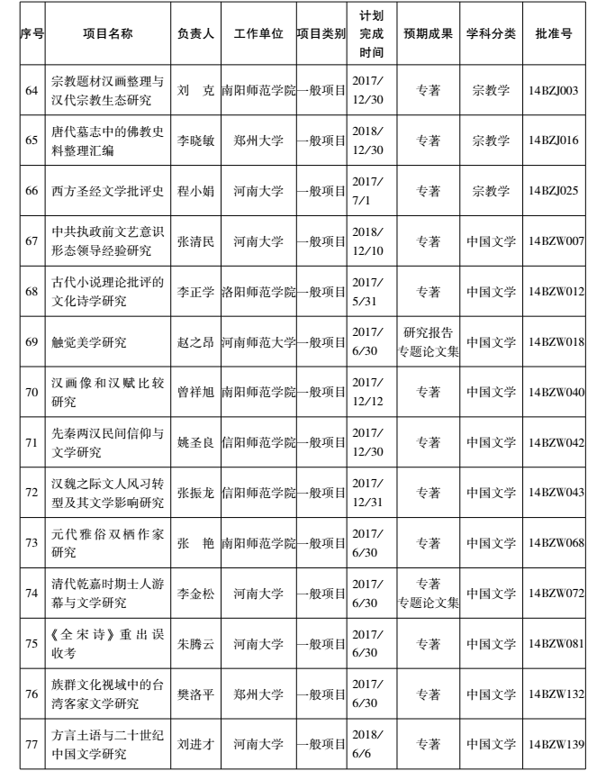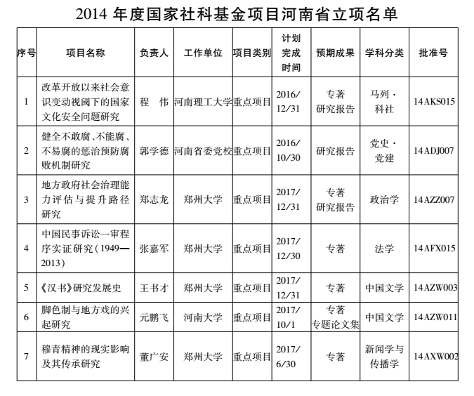 2014年度国家社科基金项目河南省立项名单